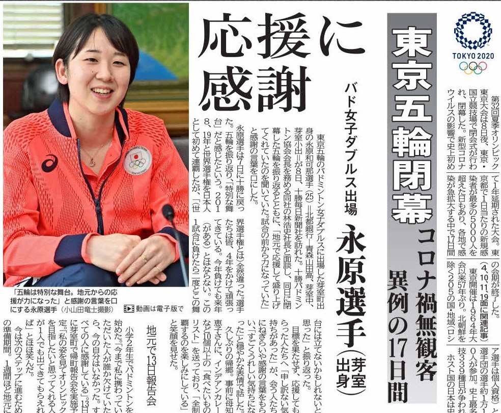 応援に感謝 五輪閉幕 女子複 永原選手 十勝毎日新聞 2021年8月9日付