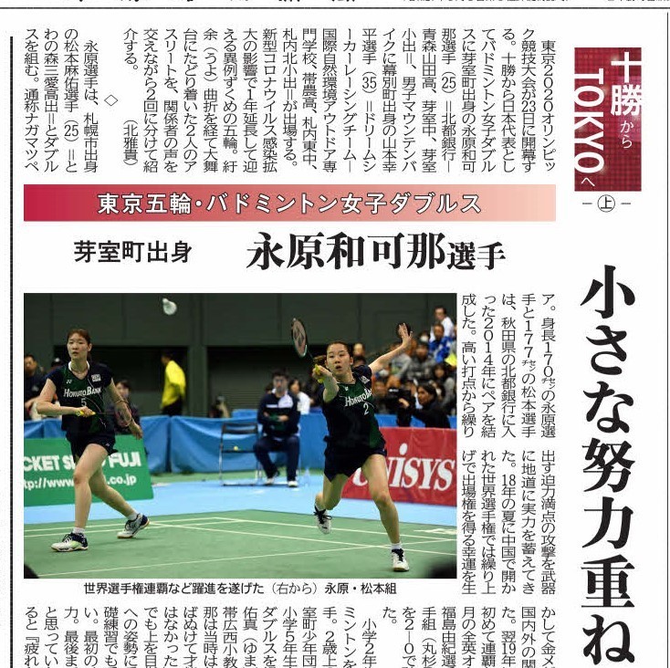 永原・松本組五輪へ 女子ダブルス十勝毎日新聞 2020年8月20日付