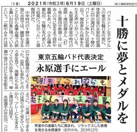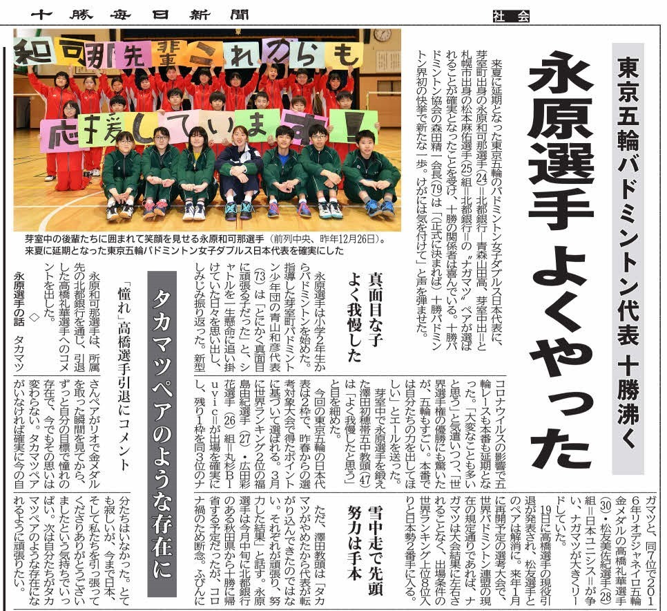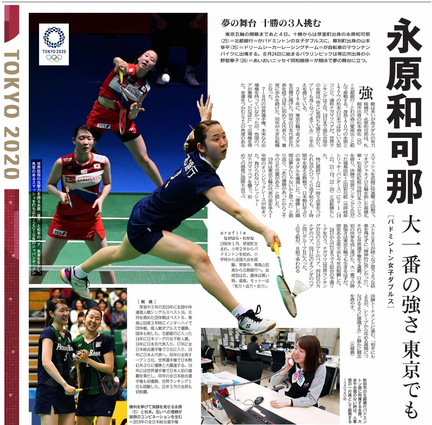永原(芽室出身)五輪決定 女子ダブルス十勝毎日新聞 2021年6月19日付