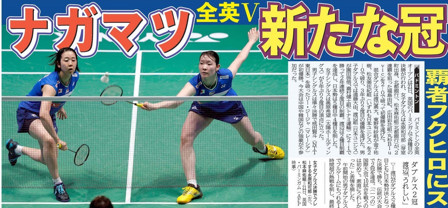 ナガマツ全英初制覇 女子ダブルス十勝毎日新聞 2021年3月22日付